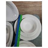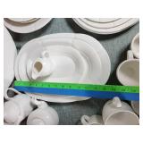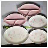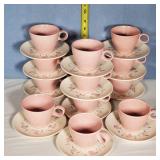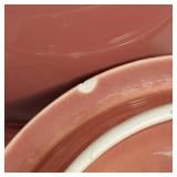 Great set, mid-century design at it's best from the late 1950s and early 1960s - pink block and line patterns on speckled white (11 each 10" and 8" and 7 -6" plates, 8 6" bowls, 3 mugs, milk pitcher, 14" and 11" oval platters), solid speckled pink (2 -14" three part relish plates, divided serving bowl, 10" salad and 6 ind salad bowls), and 2 tone set of 12 cups and saucers, covered butter dish, cream and sugar (chip to sugar bowl) - Local Pick Up Only OR buyer arranges ALL Packing and Shipping through Third Party 602