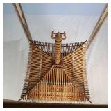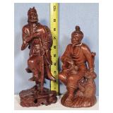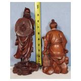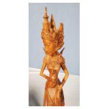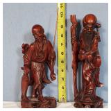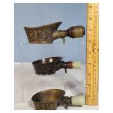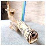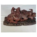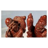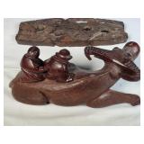 3 resting with 2 figures sitting atop and one walking with flute playing rider, all with fine hand carved stands - see photos for sizes and styles, one has repaired tail 605