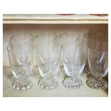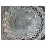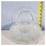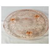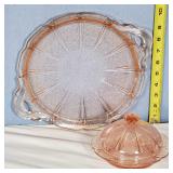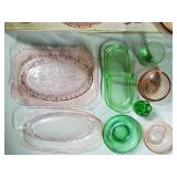 Pink depression glass oval Princess platter, Holiday Buttons and Bows oval bowl, Criss-Cross vase, Adam rectangular platter, Miss America Round platter, round 5 part relish plate with petal rib form, hex base candlesticks, handled serving bowl, ovate relish and small bowls, 13 needle etched stemware, 9 conical footed tumblers with wheel cut decoration, Green Depression era utility tray with center basket handle, colonial Knife and fork milk pitcher, small bowls, carafe, coaster and stem, plus 8 Fostoria American Lady footed Ice tea Tumblers - Local Pick Up Only OR Buyer arranges all Packing and Shipping through third party 628A