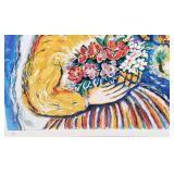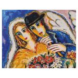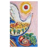 Born in Liegnitz, Poland in 1951, Zamy Steynovitz (1951-2000) spent the first few years of his life in Poland before immigrating to Israel with his family in 1957. When he was a child he developed his interest in art, beginning his artistic endeavors before leaving Poland.Her\ studied at both the Art School in Tel-Aviv and at the Royal Academy of Arts in London, and developed his artistic style through his travels around the world, exhibiting internationally. Although he frequently featured Jewish themes and tradition, he was also inspired by other subjects, such as his time in South America, still-lifes, Paris, and landscapes. Much of the evolution in his work was related to his use of color and texture, with brighter and more vivid hues and contrasts. Known as a passionate supporter of world peace, Steynovitz had many admirers in the social and community circles associated with the Norwegian Nobel Institute, and aspired to become acquainted with such Nobel Peace luminaries as Anwar Sadat, Menachim Begin, the Dalai Lama and Desmond Tutu, among others. A meeting with Pope John Paul II at the Vatican, where they had a wonderful conversation in their native Polish tongue, was one of the highlights of Steynovitz's life. Sadly, he passed away at a young age in September 2000, leaving behind a prodigious body of work that is extremely collectible and sought after worldwide.Image inspired by Marc Chagall with dove and marriage symbolism, matted under plexiglass in 33"x 40.75" frame, sight: 21.5"x28.5" {in house shipping available in oversize box} 612