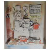 Great image of Jewish grandmother in the kitchen, 21"x17"x1.5" shadowbox frame, S.I. G. Fine Arts 1993 embossed seal, pencil signed Gomy and numbered 5/495 Stefan (Steven) Gommerman or Gomy artist. SIG is the name of Gallery Steven and Ida Gommerman. Hand colored, plate signed, 3 dimensional artwork. Gomy, a multi-talented Hungarian-born artist, has enjoyed a variety of creative pursuits in many different mediums and countries throughout the world. With his European education, GOMY studied music, writing and drawing - and became successful in all three "loves" of his life. By the age of 23, he was the most popular poser in his native Hungary, authoring some of the biggest hits. He moved to Germany and in just a few years, established himself as one of the top ten screen writers - writing and selling over 100 movie and television scripts. Several won international awards. After moving to the United States, he returned to his first love - the fine arts. This led to his venture in art publishing. When the 3-dimensional cut-out-art mania swept over the art landscape, Gomy became fascinated with this intriguing new art form and developed a unique concept. Instead of using serigraphs and/or lithographs as components for the 3-D's - like the other cut-out artists do. Gomy introduced the HAND-COLORED and HAND-CUT, MULTI-LEVELED 3-D's. Gomy's use of vibrant and lasting colors make the works vivid and intensify the 3-D effect. Although each piece is classified as part of a signed and numbered limited edition, none of them are exactly identical. Each image has its own flavor and character because of the individual hand coloring and mixed media. {in house shipping available} 603