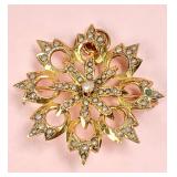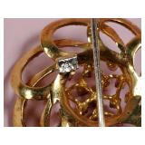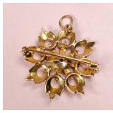 10k gold seed pearl pendant/pin (missing some pearls, 2,2 dwt.), 14k gold seed pearl lavalier with black onyx and diamond chip (2.5 dwt. incl. stones), 10k gold Shriner's pin, & 9.5mm pearl screw back earrings set in 10k gold {in house shipping available} 36