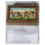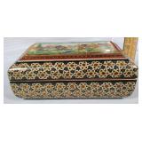Matching large and small humidors, both with hygrometers and humidity chamber, larger with tray insert, large and small all over carved camphor storage boxes, 2 La Carolina cigar boxes, narrow 12" Persian style hand painted box of tiled bone with elephant procession lid and instrument interior, Katam Art box with intricate geometric inlays of bone, wood and metal on entire interior sides Nd lid frame with hand painted Indian poli scene lid plus Art Deco champagne design storage box - see photos for details - in house shipping available 622