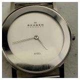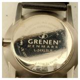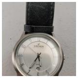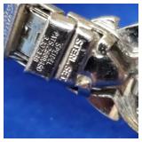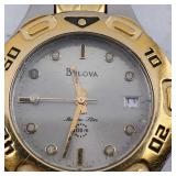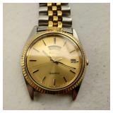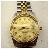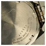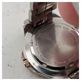 working, stainless steel case and bracelet marked 18K 750 (Not Gold) CZ gold color bezel, black face date and day. {in house shipping available} 19