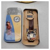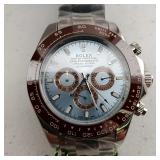 Working Rolex Replica Wrist Watch, lovely light blue face with burgundy bezel, stainless steel case and bracelet. With green display box, outer box, tag, papers, and handled bag. alot of effort went into this Replica Rolex Watch. {in house shipping available} 5
