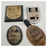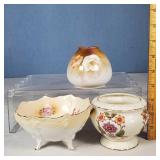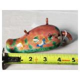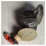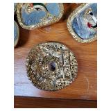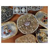 wick trimmer scissors, metal train paperweight, tea strainer ladle with holder pat 1911, Lil Bandito raccoon with cookie jar shelf accent, abalone tiled ball with holder, rinestone lined ormolu poodle rimmed glass ash tray, antique hunting scene SP match safe, 3 bathing beauty figures, 5" antique German paper mache turkey candy container, "Tin Star" shadowbox sherrif display, Terre de Fer HB&Cie France blue and white scenic small plate, Royal ALbvert Old Country Roses Ruby Collection Ribbon Collection 2002 Event Exclusive bowl with gold accented foot - contents only - local pick up only 636