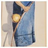 KAWANO Kaoru (1916-1965). Praying girl with doves, Great Mid-Century Modern Japanese woodblock design of girl wth doves at her feet, red chop mark to bottom left - 14 1/2" x 10" sight, matted under glass in 20" x 15 1/2" frame - Local pick up only OR buyer arranges ALL shipping and packing thorough third party vendor. 594