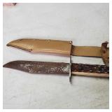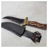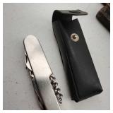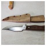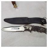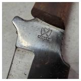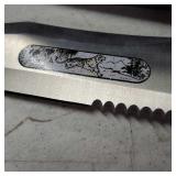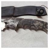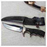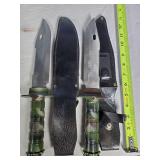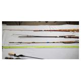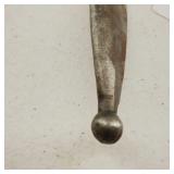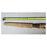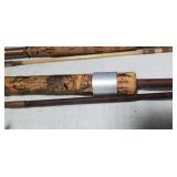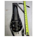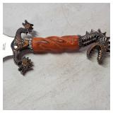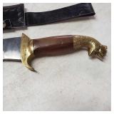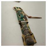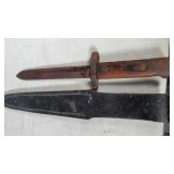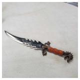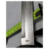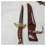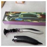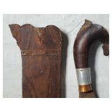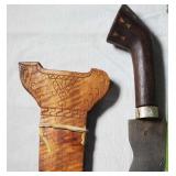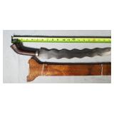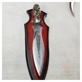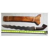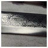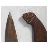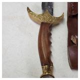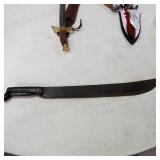20" Keris/ Kris with sinuous blade, inlaid wood handle and carved wood sheath (separated),20" Keris with traditional carved hardwood pontil, (hairline in handle) machete style blade and wood sheath with point and hilt design carvings,22" wood training blade/ fighting baton, 42" horse head hilt fantasy sword #440 stainless steel and 31" Pakistan steel sword with stylized handle, tapered leaf form blade and leather sheath -with padded plastic carrying case {in house shipping available} 637