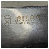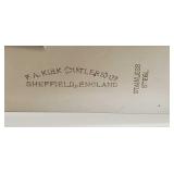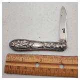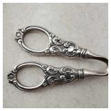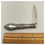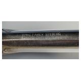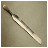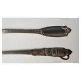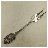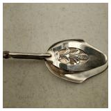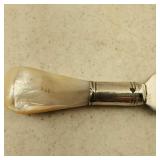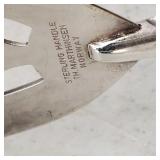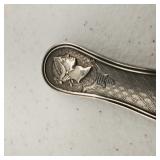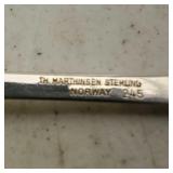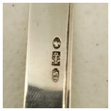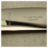 1 - NM Norsk Monster Viking Rose 830s Silver Norwegian Olive Fork 4 3/8” designed By TH Marthinsen , 4 - NM Norsk Monster 830s silver Vidar dinner knives, 4 - Royal Danish International Sterling Coffee Spoons, 3 - Norwegian Brodrene Mylius "Tele" coffee spoons wih gold wash.1- silver handle cheese shaver, 1- Marthinsen Sterling Silver handle pastry tongs. 1- MOP handle with silver collar bread knife. total weight 21.390 ozt. {local pick up or in house shipping available} 34