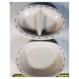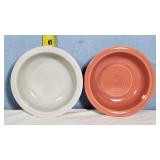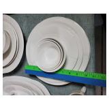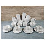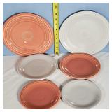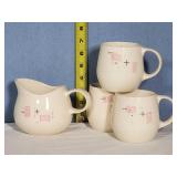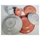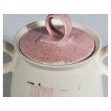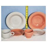 Great set, mid-century design at it's best from the late 1950s and early 1960s - pink block and line patterns on speckled white (11 each 10" and 8" and 7 -6" plates, 8 6" bowls, 3 mugs, milk pitcher, 14" and 11" oval platters), solid speckled pink (2 -14" three part relish plates, divided serving bowl, 10" salad and 6 ind salad bowls), and 2 tone set of 12 cups and saucers, covered butter dish, cream and sugar (chip to sugar bowl) - Local Pick Up Only OR buyer arranges ALL Packing and Shipping through Third Party 602