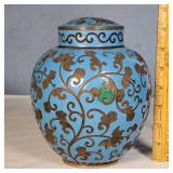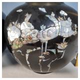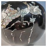 Pr of 9" vases, pr of 8" ginger jar vases (no lids, some loose mother of pearl pieces) and 12" long smoke set box with MOP bird on branch lid, inside brass ashtray and cigarette box insert with MOP calligraphy mark lid - some minor lacquer issues - in house shipping available 620