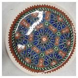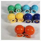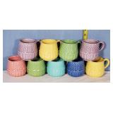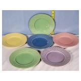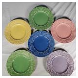 Celebration pattern features a plane center with beautiful basket weave embossed rims in tones of green, light and deep blue, lavender, rose and yellow - mark reads "Bordallo Pinhiero Caldas Da Rainha Made in Portugal" - 6 each 12" dinner,10" salad and 8" dessert/ bread plates with 9 mugs - some minor wear marks and occasional crazing to plates, all still with great eye appeal, mugs seem perfect - see photos for details - Local Pick up Only OR Buyer arranges ALL Shipping and Packing through third party 626