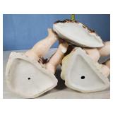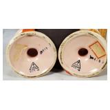 one baby holds a cup, the other a doll (both need a good cleaning, but no breaks, cracks or chips), one with red number and arrow mark on base, spill vase features seated bagpiper between 2 vase ends making an arch above his head, marked Made in Germany on base - in house shipping available 629