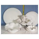 Pink depression glass oval Princess platter, Holiday Buttons and Bows oval bowl, Criss-Cross vase, Adam rectangular platter, Miss America Round platter, round 5 part relish plate with petal rib form, hex base candlesticks, handled serving bowl, ovate relish and small bowls, 13 needle etched stemware, 9 conical footed tumblers with wheel cut decoration, Green Depression era utility tray with center basket handle, colonial Knife and fork milk pitcher, small bowls, carafe, coaster and stem, plus 8 Fostoria American Lady footed Ice tea Tumblers - Local Pick Up Only OR Buyer arranges all Packing and Shipping through third party 628A