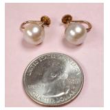 10k gold seed pearl pendant/pin (missing some pearls, 2,2 dwt.), 14k gold seed pearl lavalier with black onyx and diamond chip (2.5 dwt. incl. stones), 10k gold Shriner's pin, & 9.5mm pearl screw back earrings set in 10k gold {in house shipping available} 36