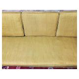 78" wide. retains all original Fagas straps and cushions (cushions stiff, but still intact( - stunning Danish modern sofa designed by architect and furniture designer Ib Kofod-Larsen for Selig in Denmark, circa 1960s. This iconic sofa features a solid walnut frame with sculptural armrests and slatted backrest. Its eye-catching sleek design is ideal for any type of decor. {BUYER ARRANGES PACKAGING AND SHIPPING OR LOCAL PICK UP} 11
