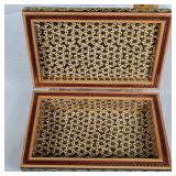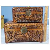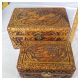 Matching large and small humidors, both with hygrometers and humidity chamber, larger with tray insert, large and small all over carved camphor storage boxes, 2 La Carolina cigar boxes, narrow 12" Persian style hand painted box of tiled bone with elephant procession lid and instrument interior, Katam Art box with intricate geometric inlays of bone, wood and metal on entire interior sides Nd lid frame with hand painted Indian poli scene lid plus Art Deco champagne design storage box - see photos for details - in house shipping available 622