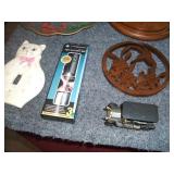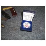 Antique Cabinet, Oak Vintage Dining Table & Chairs, Rocking Chairs, Old Singer Sewing Machine Cabinet, Iron King Bed, Washer & Dryer, Chest, Dresser Set, Book Cases, Coffee Table Set, Aladdin Lamp and other Oil Lamps, 1986 Coke Tray, Constitution Clock, Lighters, Compass, Hand Made Cedar Ship, Old McCoy Vase, Knives Case and Boker, Colorized 1999 Silver Eagle, Prints, Touch Watch, Jewelry, Pepsi Items, Tonka Trucks, Die Cast John Deere and Farm All Tractors, Flat Screen TV, Tools, Cast Iron Dutch Oven and Skillets, Stock Pots, Purses, Metal Wire Mesh Sections, Marble Rolling Pin, Owl Collection, Figurines, Glassware, Glass Toc-Tac-Toe Game and other Games, Ralph Loren Queen Sheets, Hand Made Quilts, Quilt Racks, Ground Breaking Shovel, Civil War Books, Tool Bag, Sun Glasses, Georgia Power Atlanta Olympic Pin Set, Binoculars, Under Counter Lights, Massager, Pink Carnival Glass, Fergie Ladies Boots, Palm Sander, Iron Old Bank, Dream Catchers, Quick Draw Holster and Gun Belt, Large Ceiling Fan w/ Remote, Silver Ice Bucket, DVD’s, Cedar Chest, Storage Tubs, Hand Tools, Hand Truck, and Lots More, With Our Four for a Dollar / Free Tables are Overflowing.