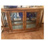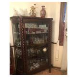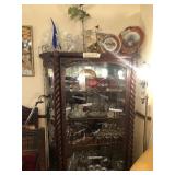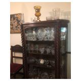 - lighted oak beveled glass display cabinet; outstanding antique china cabinet with curved side glass and turned posts;