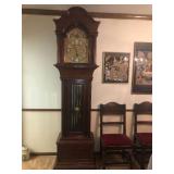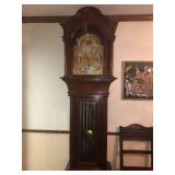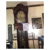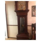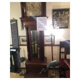 - RARE circa 1900’s Elliot London 90” (approx. 7 ½’ tall) working Case Grandfather Clock with nine Harris & Harrington Tubes (chimes both Wittington & Westminster) 3 weights – clock face is marked Elliot London & also Edward Vail & Co, Wichita Kansas from where it was purchased. Expert has looked at clock – it is working and runs.