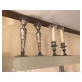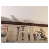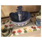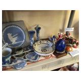 - Wedgewood blue/white pair of candleholders, trumpet vase;