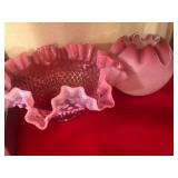 - Vintage Fenton cranberry opalescent hobnail bowl, Fenton pink swirl stripe vase, Fenton pink opalescent round vase with pinched rim;