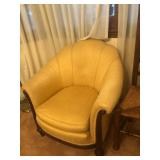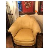 - Distinctive carved mahogany antique rounded-back pale yellow armchair.