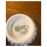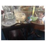 - Vaseline opalescent sugar & creamer as well as glass dolphin curved-top compote;
