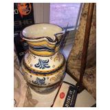 - 12” vintage art pottery pitcher handpainted, handturned signed Flavera Espana;