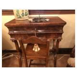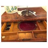 - RARE antique Mahogany desk; large round 2 drawer antique pedestal table; RARE antique 1800’s ribbon Mahogany desk with key and matching chair;