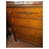 - Circa 1920’s RARE handpainted floral on Birds-eye Maple vanity and stool, 4 drawer chest & bed.