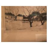 - Drypoint etching 1930 “Farmhouse in Winter” signed noted artist Chauncy S Ryder;