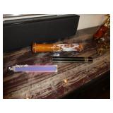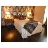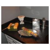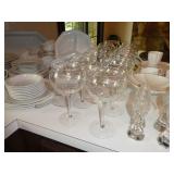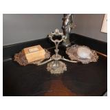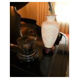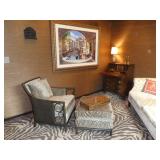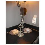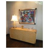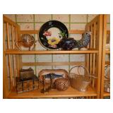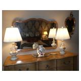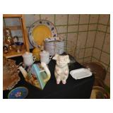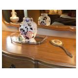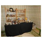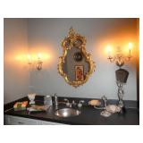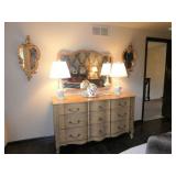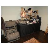 Vintage Murano Glass gold fleck pineapple lamp with silk shade Set of 12 mirrored placemats Mid Century biomorphic lucite bowl Vintage Diana carriage clock White cinnabar vase Large Native American style woven basket Iron wine rack Kaleidoscope collection Antique iron elephant cigarette dispenser Semi antique hand woven wool rug 6’x 9’6” Signed carved wood/chrome pair geese Elephant collection Pair of Chinese carved wood ox’s Perfume bottles including Baccarat Lopez ceramic lion vase Michael Aram olive branch frame 2 piece brass llama sculptures Large hand blown flower Pair of Asian hand painted bird plaques Brighton dresser tray French-style gilt mirrors Vintage horse cane Venus Et Fluer large round rose box Carved Chinese pipe stand Bronze candelabra lamp Picture frames Vintage Italian Venetian mirror 24”x19” Chinese porcelain ginger jar lamp Jay Spectre for Paul Hanson 1980’s Dinanderie lamp Restoration Hardware queen size bedding set Pair of vintage hand painted porcelain lamps Victorian walnut deep frame mirror Vintage mahogany table top mirror Authentic vintage Christian Dior Diorissimo Luggage 6pcs CHINA & CRYSTAL