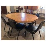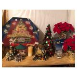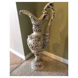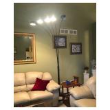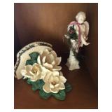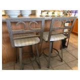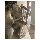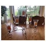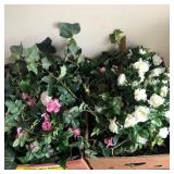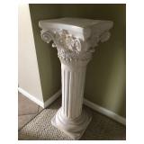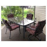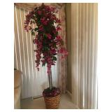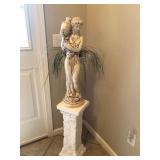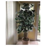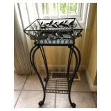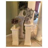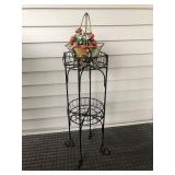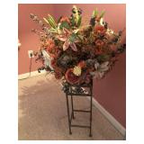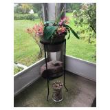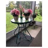 Beautiful wrought iron / glass top patio table with 4 chairs, faux marble pedestals, several plant stands, silk tree, silk arrangements…