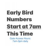 THE FIRST DAY EARLY BIRD NUMBERS WILL BE GIVEN OUT AT 7AM: