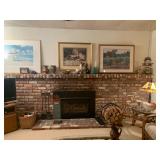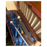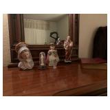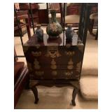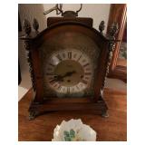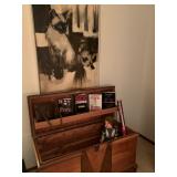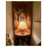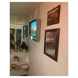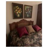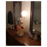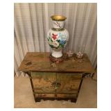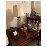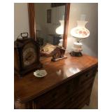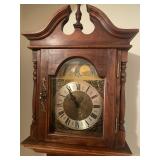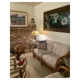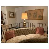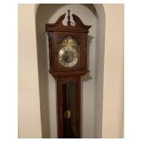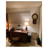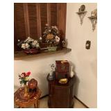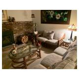 FURNITURE AND HOME DÉCOR: Hall clock, original artwork, pair of tiffany style tabletop lamps, long drop regulator wall clock, king bed frame, nightstands, bedroom sets, bamboo couch, love seat and matching coffee table, nice rugs, side tables, corner display cabinet, decorative pillows, brass hanging fish, Japanese Tansu and more!