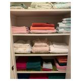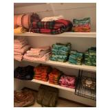 LINENS: Kitchen towels, queen and twin sized blankets, bath rugs, towels, knitted bed linens, tablecloth and napkin sets, sheet sets- queen and king