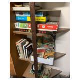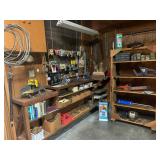 GARAGE AND SUCH: Wooden ladders, nails, bolts, screws, new accessories, large rolls of construction paper, roll paper cutter and holder, hanging light fixture, table saw, hand tools, etc.…