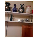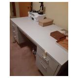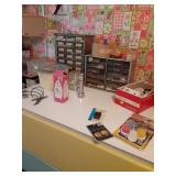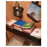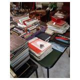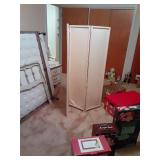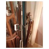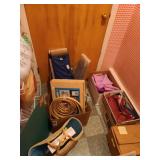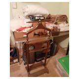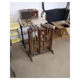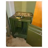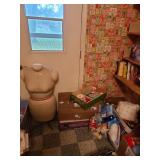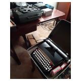 Miscellaneous: 40 pieces pink depression glass, Owosso Memorabilia /Spics/ Fire Place accessories, w/stand, Coal bucket, Wrought iron wood basket, Emerald typewriter in case, LaSalle Stenotype machine, Griffin Shoe Master wooden kit, Playmate check machine, Brass handle walking stick, 1 carved wooden waking stick, Plant stand, Baskets, Flower baskets, Pant hangers, Dress hangers, Drapery hooks, Sewing items / Yarn-Thread, Bells, 33 1/3 & 78 Records, Figurines, Upright Kirby vacuum, Foreign Electricity Converter Kit, Linins, Ladies Clothing & various ladies hats, Umbrellas, Metal crutch w/ arm brace, Country western square dancing bows, bowties & accessories, E-Z fold step stool, 3 wooden step stools, Office chair, Samsonite luggage, Olympia luggage, Jewelry box, All Steel safe /The General Fireproofing Co USA,