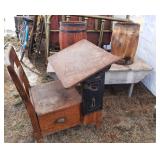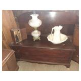 Furniture to include: 4 stack Globe- Wernicke oak barrister bookcase, wicker couch, wicker chairs, maple hutches, Hitchcock decorated chairs, Eastlake shelves, Art Deco bedroom set, cedar chests, Brass bed, assorted stands, small tables and chairs.