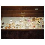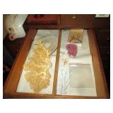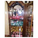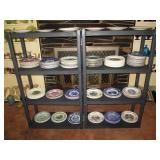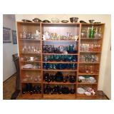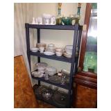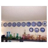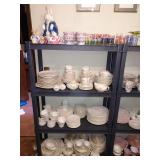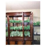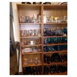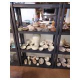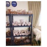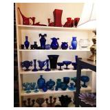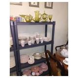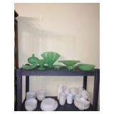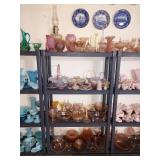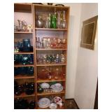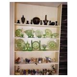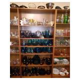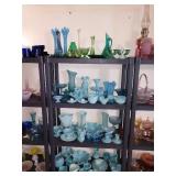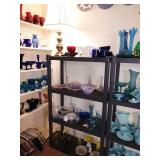 Living Room--TV Room--Dining Room: Glass and china: We have loads of each. Glass includes Fenton – many colors including old and newer Jadeite, stretch glass , milk glass, Burmese, signed and unsigned. Fostoria – not only in clear but slag pink, turquoise and others. Anchor Hocking milk glass swirl with gold trim, Westmoreland amber twist, Duncan & Miller Canterbury Chartreuse, Cambridge Crown Tuscan, plus depression glass in pink, amethyst, aqua, cobalt blue, gold and more. Lots of vintage Fire King- both Jadite and milk glass. Tons of clear glass – too many makers to list. China Dinne r sets – we have large sets of Premiere Candlelight, Wedgewood, Noritake Asian Song, Vintage Homer Laughlin Eggshell Nautilus, Edwin Knowles Wheat pattern, Smaller and partial sets of Newcor, Noritake Chintz, Noritake New Decade, Roya l Doulton Blue Iris. Poland Boleslaweic pottery, Also lots of vases, misc. serving and candy dishes and trays – covered trinket china and glass dishes.
