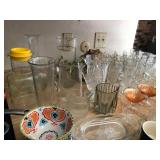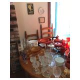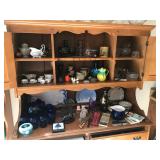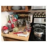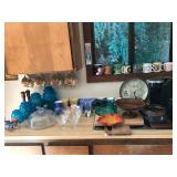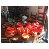 KITCHEN: full kitchen, salt, and pepper collection, Metlox orange dish set, pots and pans, vintage pitchers, depression glass, crystal, cookbooks, platters, dish sets, Keurig, dining tablecloths, napkins, and placemats