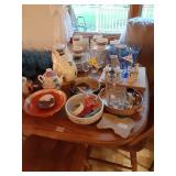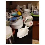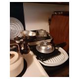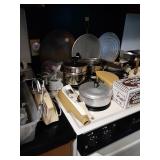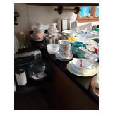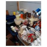 Kitchen: Glassware, Crystal Wine glasses, Pots & Pans, Pyrex Refrigerator set, Corning ware, Pampered Chief, Tupper ware, Cookie Jar, Lexox temper ware 12 pc set, Dishware, Crystal and more…