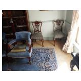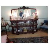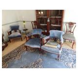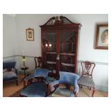 BEAUTIFUL 7 PIECE MAHOGANY ORNATELY CARVED CHINESE CHIPPENDALE DINING ROOM SET. ROOM SIZE MAHOGANY W CARVED MARBLE TOP SIDEBOARD. THREE ADDITIONAL MARBLE TOP SIDE BOARDS MAHOGANY EXECUTIVE DESK, FIVE PIECE CASUAL DINING ROOM SET.