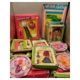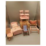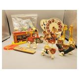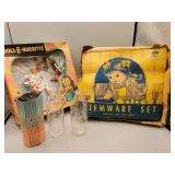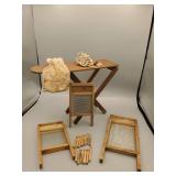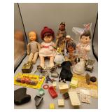 Vintage Toys include a Tin Toy Typewriter in Original Box, Mickey Mouse Doll, Keystone Battleship, Ginny Dolls and Furniture, Black Americana Dolls, GI Joe, Barbie, Skipper, Mego Wizard of Oz, Mego Cher, Mego Diana Ross, Pulsar Man, Composite Baby Dolls by Ideal and Effanbee, Porcelain Dolls, Doll Accessories with primitive child size vintage utensils with wood handles, ironing board, washboards, aluminum baking sets, China tea set, Hot Wheels Red Line Cars, Fisher Price Toys, Games, and more.