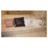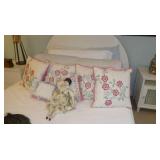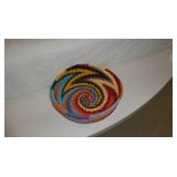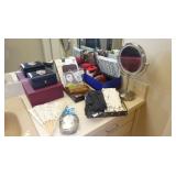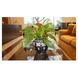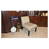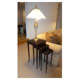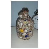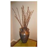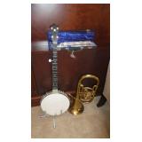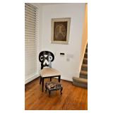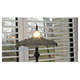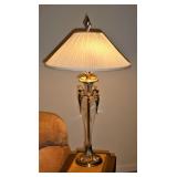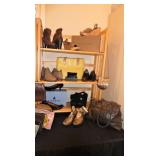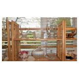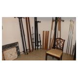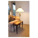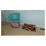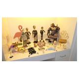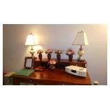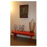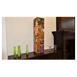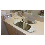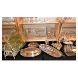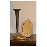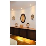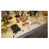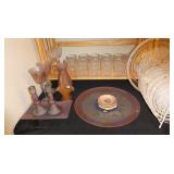 DECORATIVE ACCESSORIES & ANTIQUES Pair of Chapman brass and glass lamps Venetian glass table top mirror Vintage oval crystal bowl in bronze stand Antiqued metal trumpet vase 4 cased green glass vases Pair of hand painted ceramic vases Oval beveled mirror Mirror with carved frame Vintage oval wood dough bowl Set of vintage beaded fruit Silverplated serveware Set of 3 hand carved wood musicians Folk art style dolls Memory Jug and plaque Folk Art-style picket fence flag wall hanging South American wool woven rug Victorian beaded flowers Picture Frames Vintage floor lamp with beaded shade French deco iron mirror coat rack