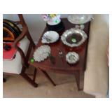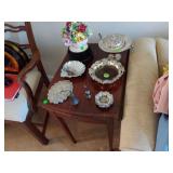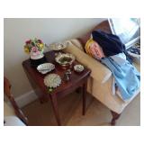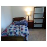 TWO PIECE STACKING BOOKCASES. TWIN BED W BEDDING. MAHOGANY DROPLEAF TABLE
