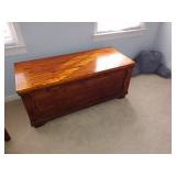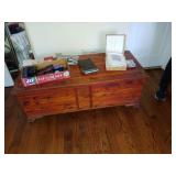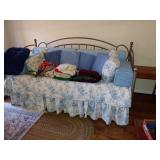 FLORAL WINGBACK CHAIR. PINE CEDAR CHESTS . GRAY/SILVER METAL DAY BED. WHITE PAINTED LADIES WRITING DESK. PAIR OF SMALL MAPLE NIGHTSTANDS