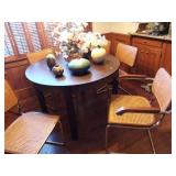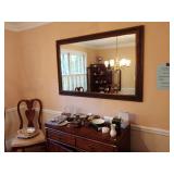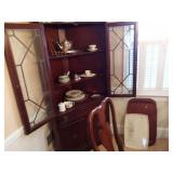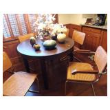7 PIECE MIDCENTURY MODERN ROUND DINING ROOM SET RATTAN METAL AND WOOD CHAIRS. MAHOGANY CORNER CUPBOARD. 5 PIECE TRADITIONAL CHERRY DINING ROOM SET. WOODEN CARVED MIRROR