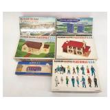 607 PLASTICVILLE 5 KITS, TOWN HALL,N.E. RANCHER, H. UNDER CONSTRUC,TELE POLES & PLAYGROUND, OB, N.N.C.